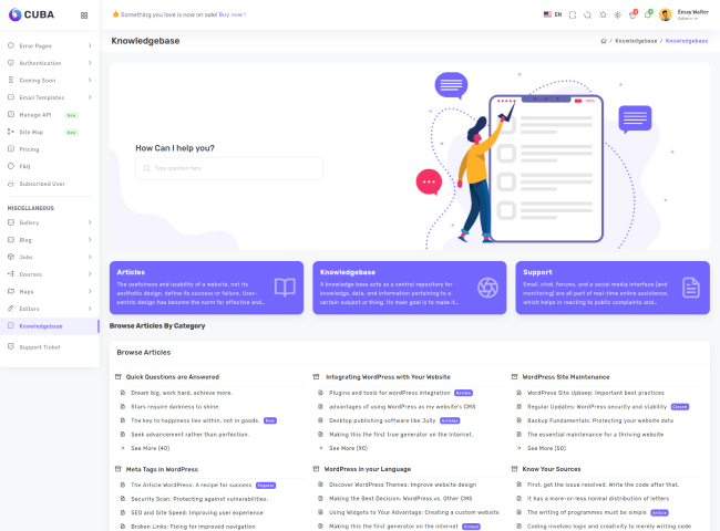 Html, Vue, Angular, React, Django, Laravel , Nodejs , Codeigniter , Flask, PHP all this versions documentation available in cuba admin template